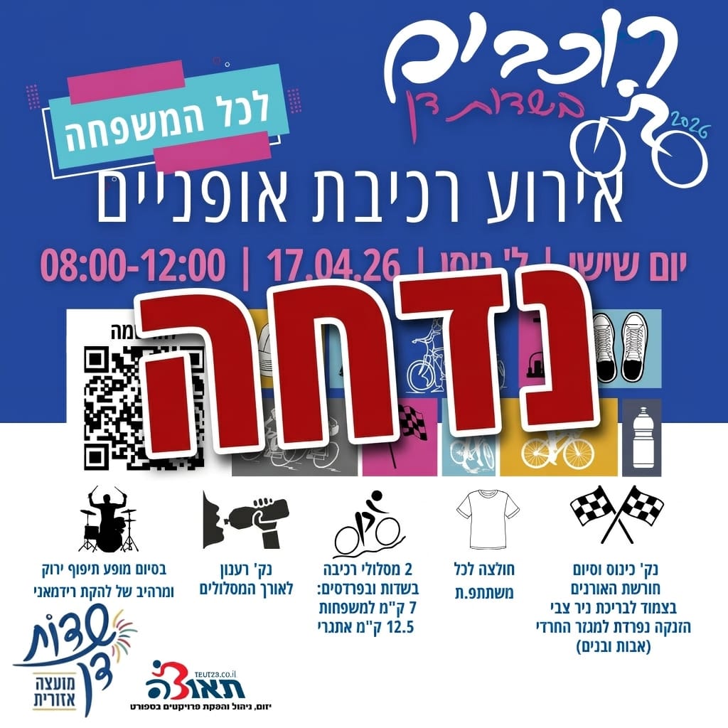 אנחנו עובדים על תאריך חדש שבו נוכל לרכוב בבטחה ובכיף, ונעדכן אתכם ממש בקרוב. המשיכו לתחזק את האופניים, אנחנו עוד ניפגש על המסלול!