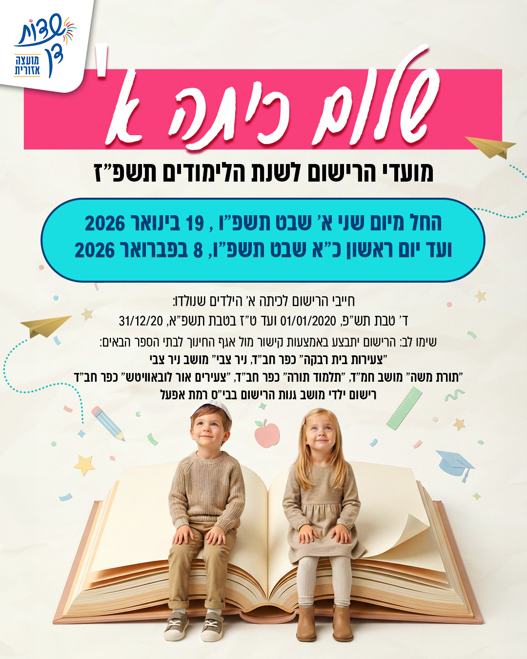 חייבי הרישום לכיתה א' הילדים שנולדו: ד' טבת תש"פ, 01/01/2020 ועד ט"ז בטבת תשפ"א, 31/12/20