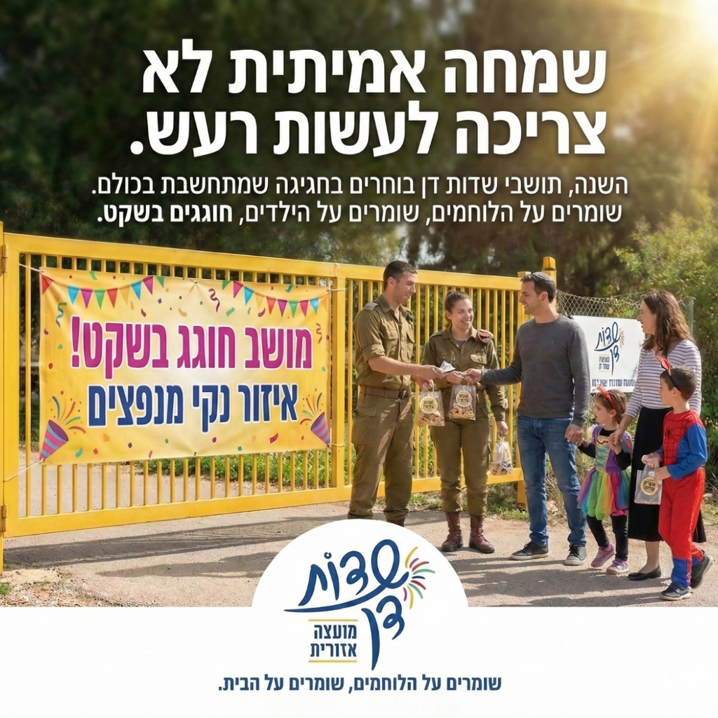 החיים ביישוב קהילתי הם זכות גדולה, אבל השנה היא מגיעה עם אחריות גדולה עוד יותר. בשדות דן, "השכן מהבית ליד" הוא לא דמות אנונימית, הוא הלוחם שחזר מהמילואים, הוא הילד שגדל אצלנו בשבילים, הוא חלק מהמשפחה המורחבת של כולנו. בפורים הזה, אנחנו לא נותנים לרעש של