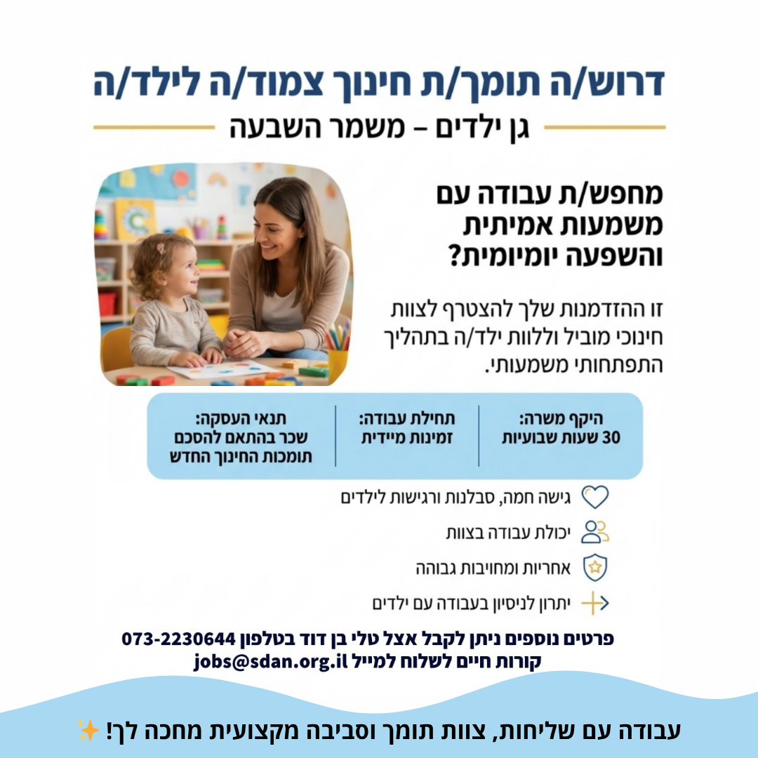 מועצה אזורית שדות דן מזמינה אתכם להצטרף לצוות חינוכי מוביל. אם אתם מחפשים עבודה עם משמעות אמיתית והשפעה יומיומית, זו ההזדמנות שלכם להשתלב בגן ילדים איכותי במשמר השבעה, ללוות ילד/ה בתהליך התפתחותי משמעותי ולהיות חלק מצוות חם ותומך.