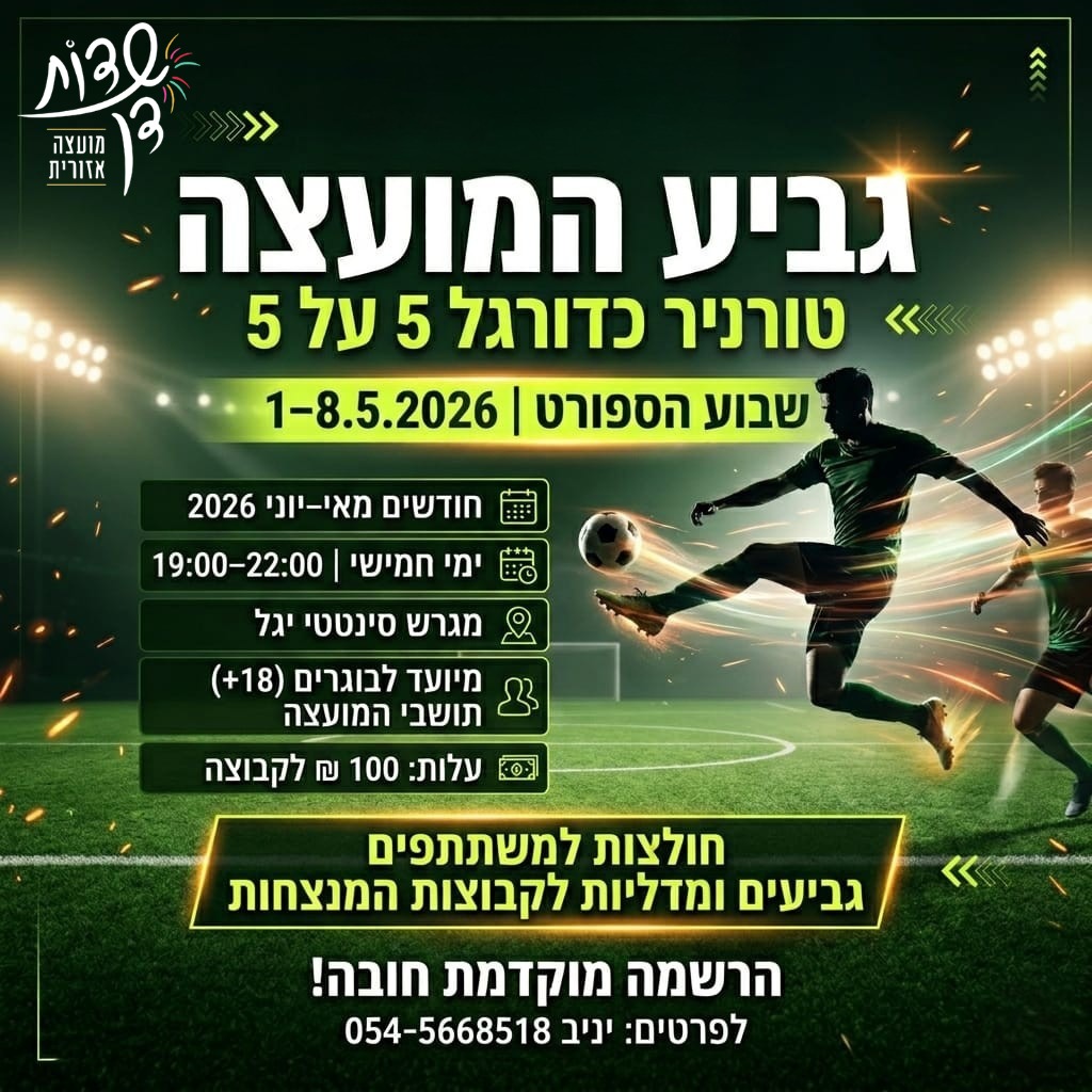המועצה האזורית שדות דן מזמינה אתכם לקחת חלק בטורניר כדורגל 5 על 5 לבוגרים (18+), שיתקיים במסגרת פעילויות הספורט בחודשי הקיץ הקרובים.