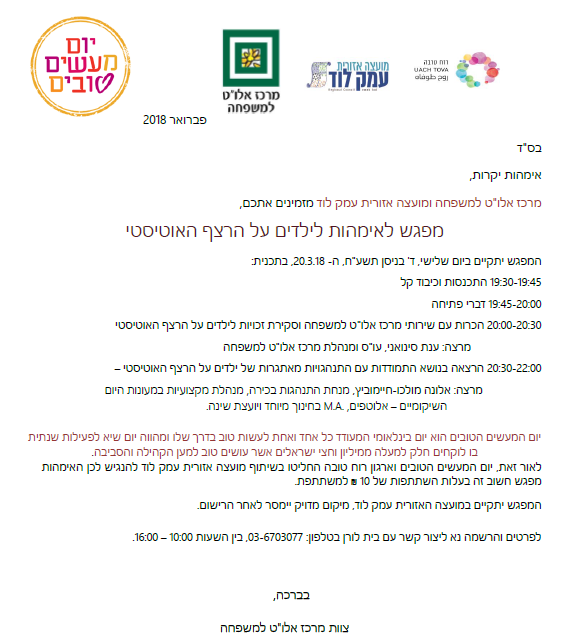 מפגש למשפחות המתמודדות עם אוטיזם- יום המעשים הטובים