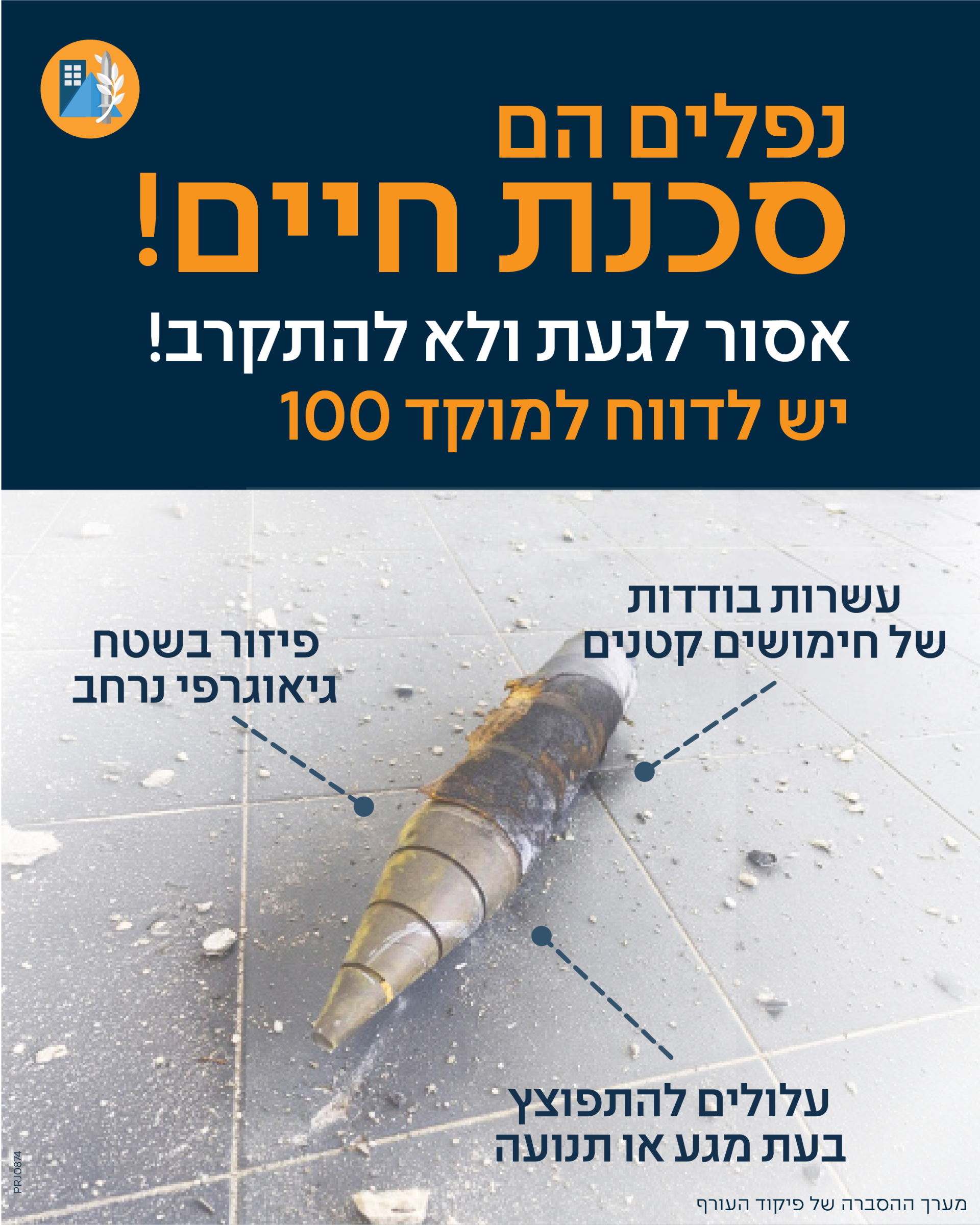 ● שימו לב! לא מדובר בשברי יירוט אלא בחימושים שעלולים להתפוצץ בעת מגע.